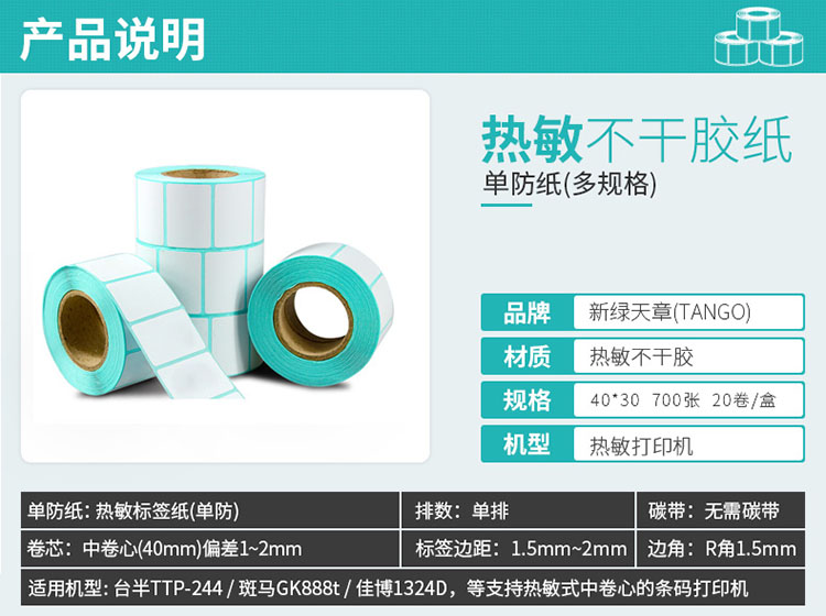 天章(TANGO)热敏标签打印纸40mm*30mm不干胶标签纸 条码纸/电子秤纸 700张