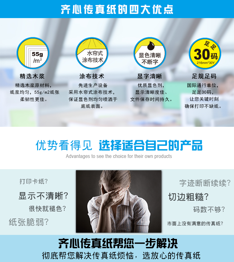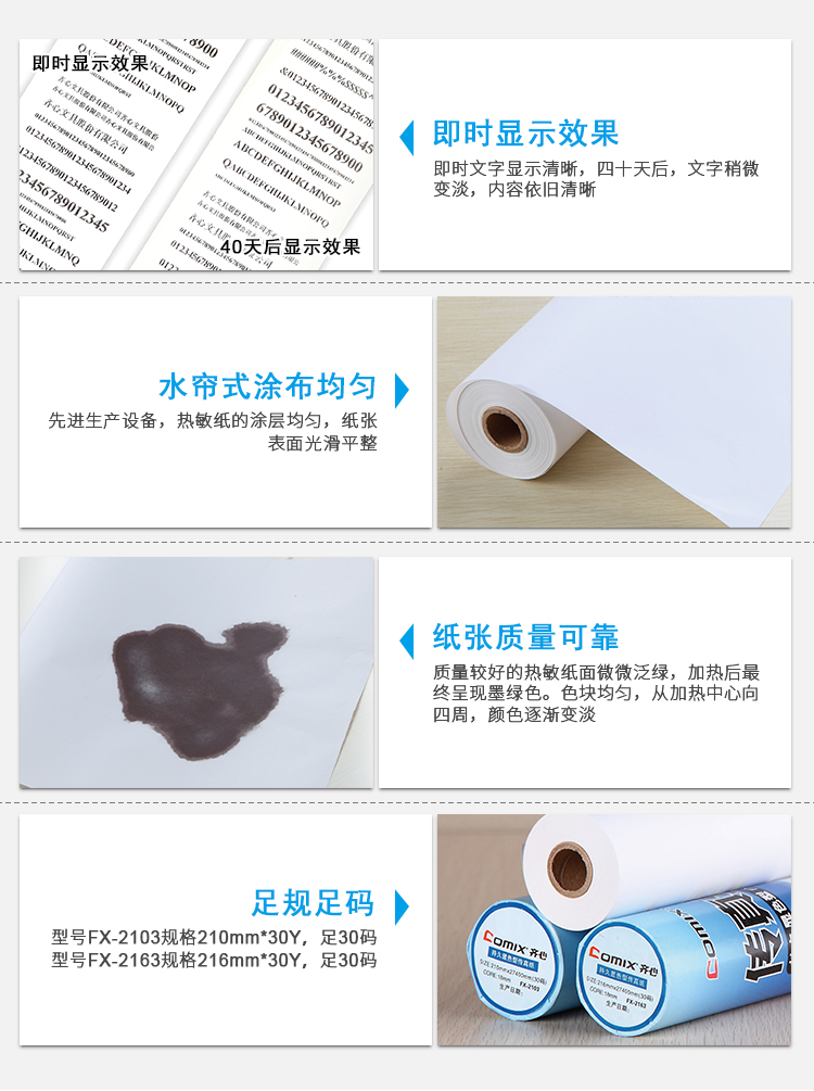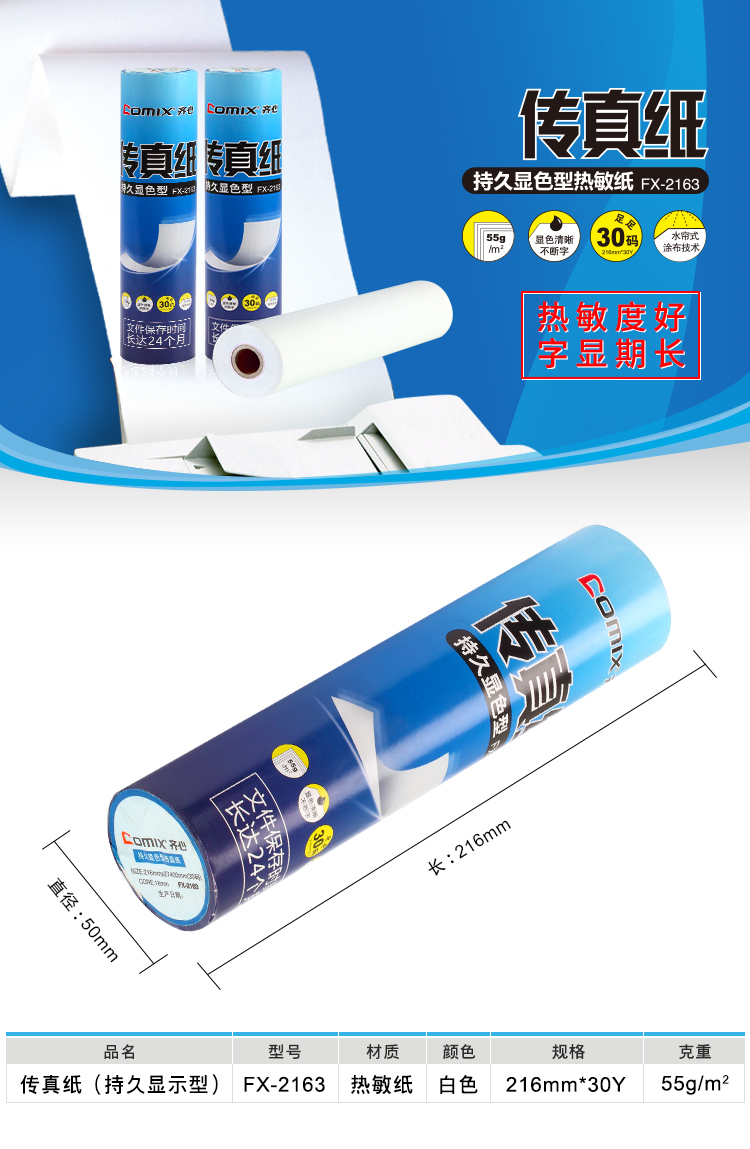 齐心 FX-2163 热敏传真纸 216mm*30y 白色 20卷/盒,6