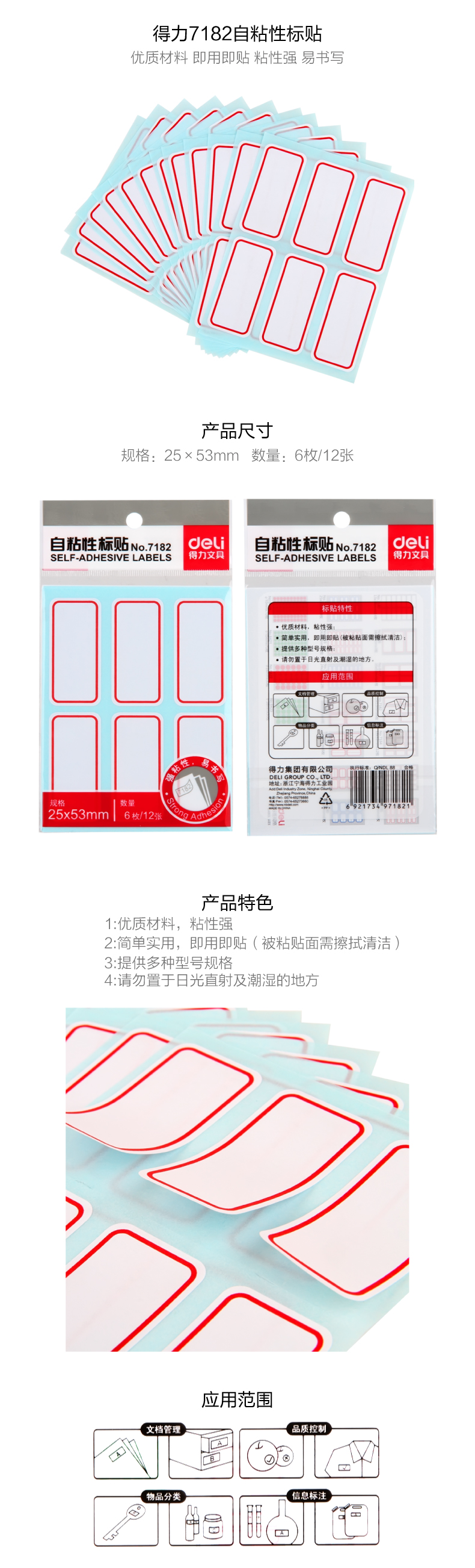 得力 7182 自粘性标贴 25*53MM 白色 红框